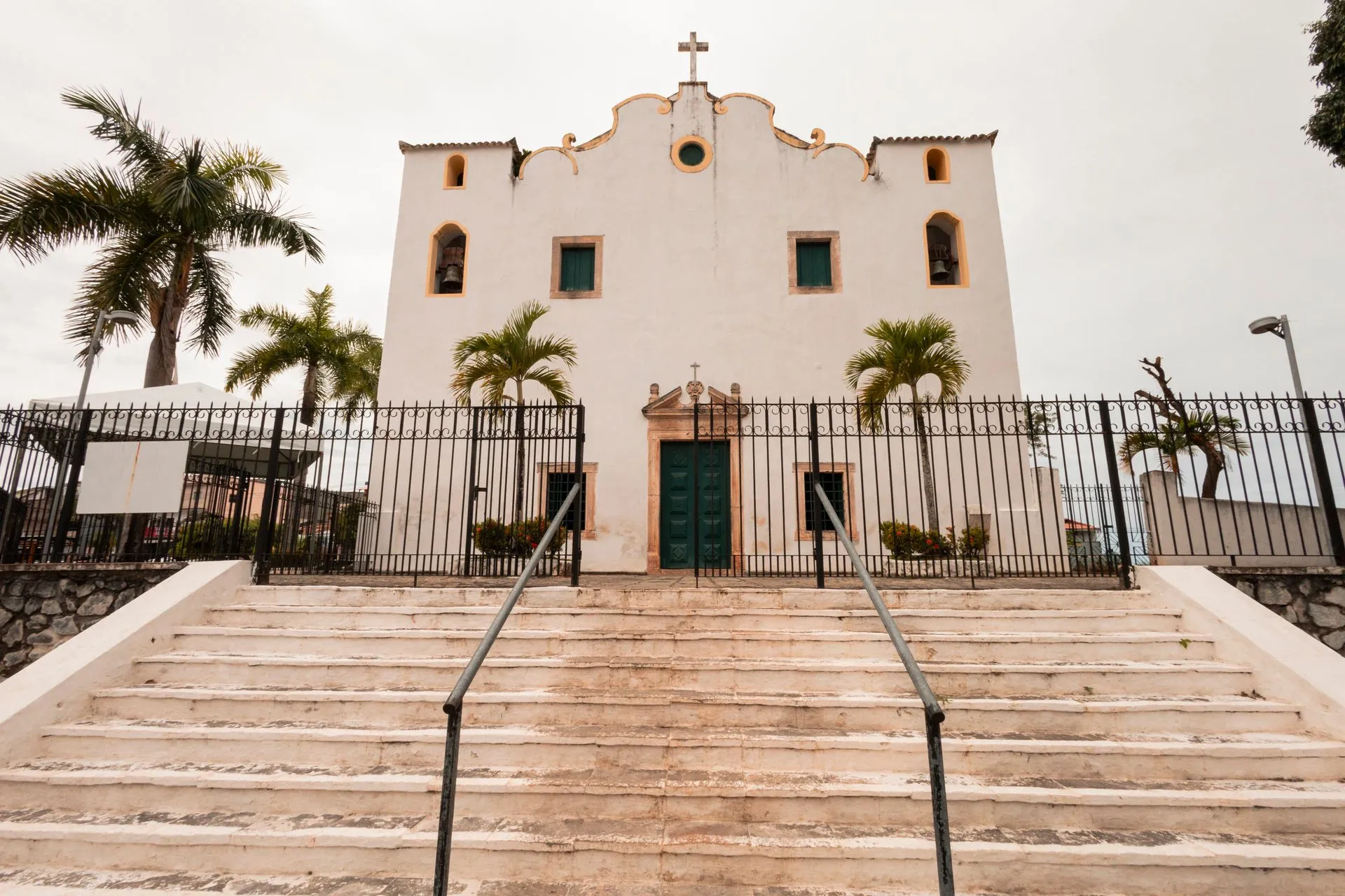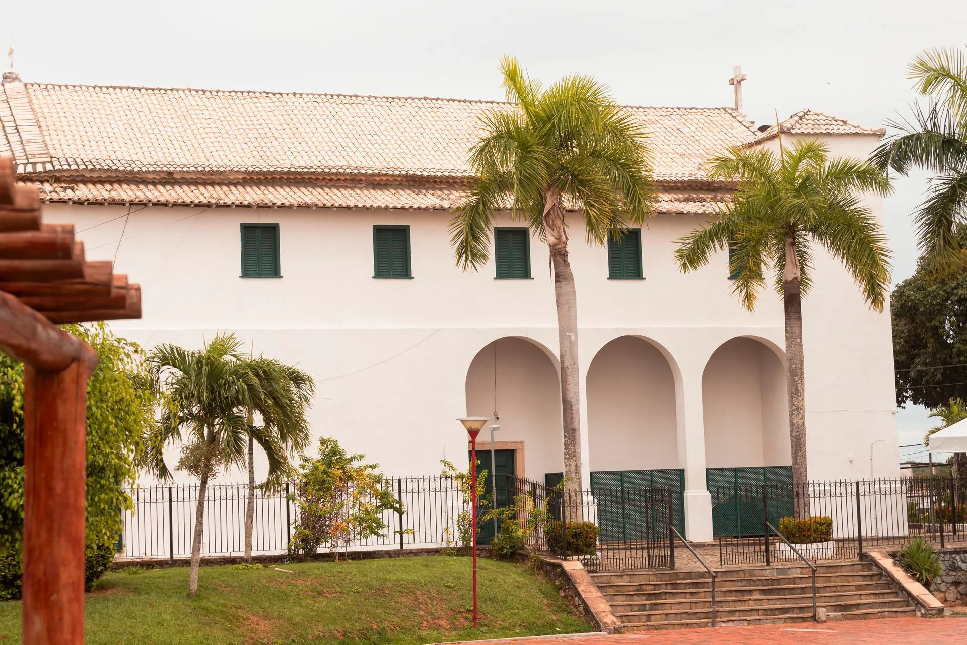 A fachada da igreja é marcante, com torres baixas cobertas por telhados em forma de pirâmide e um frontão com detalhes curvos e um óculo circular. A entrada principal é em arenito e tem duas janelas com grades de ferro e molduras de arenito ao lado.