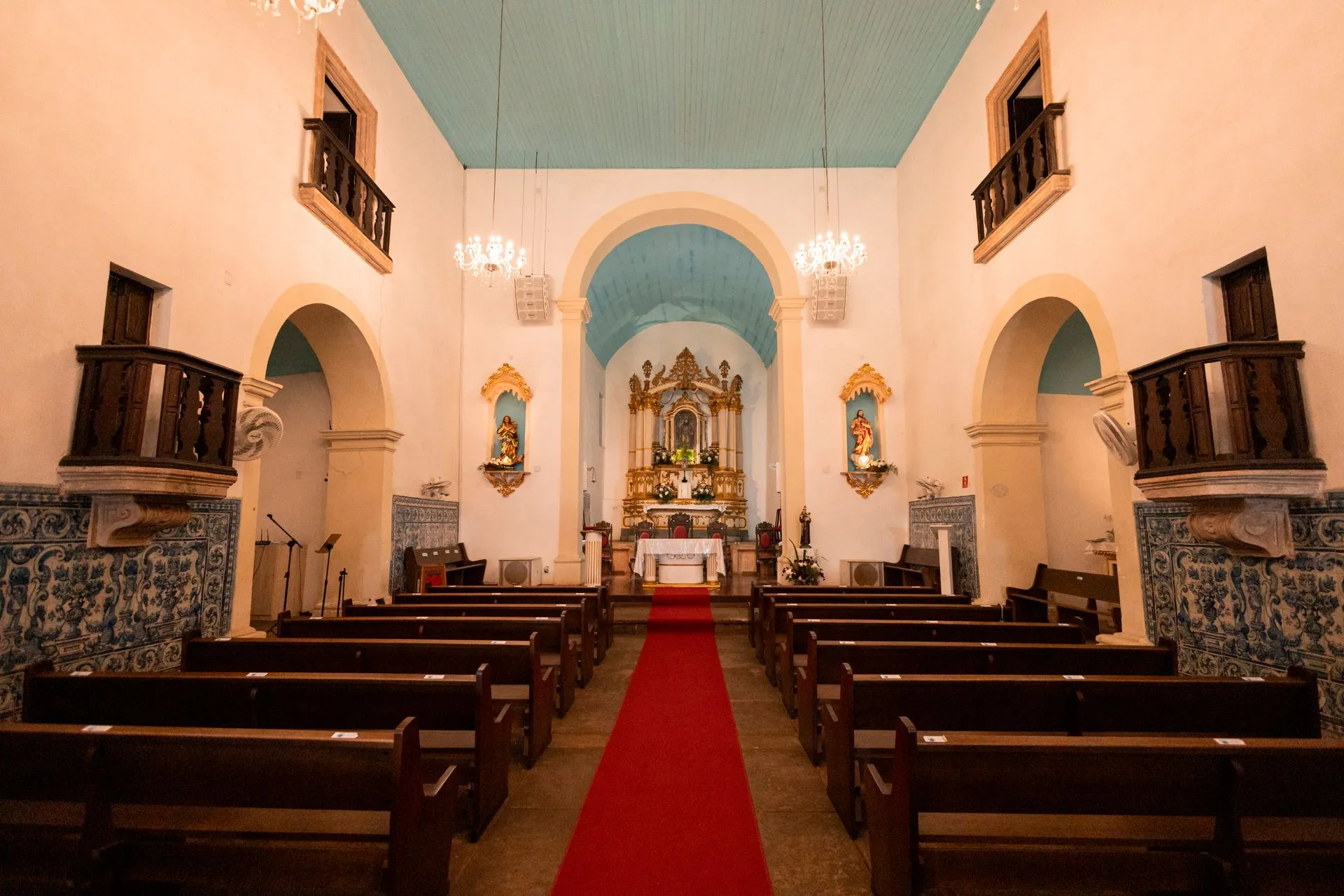 No interior, que foi reformado em 1975, há uma barra de azulejos que cobre toda a nave e a capela-mor, com um padrão que parece um tapete e motivos variados. Esses azulejos são alguns dos maiores encontrados na arquitetura luso-brasileira.